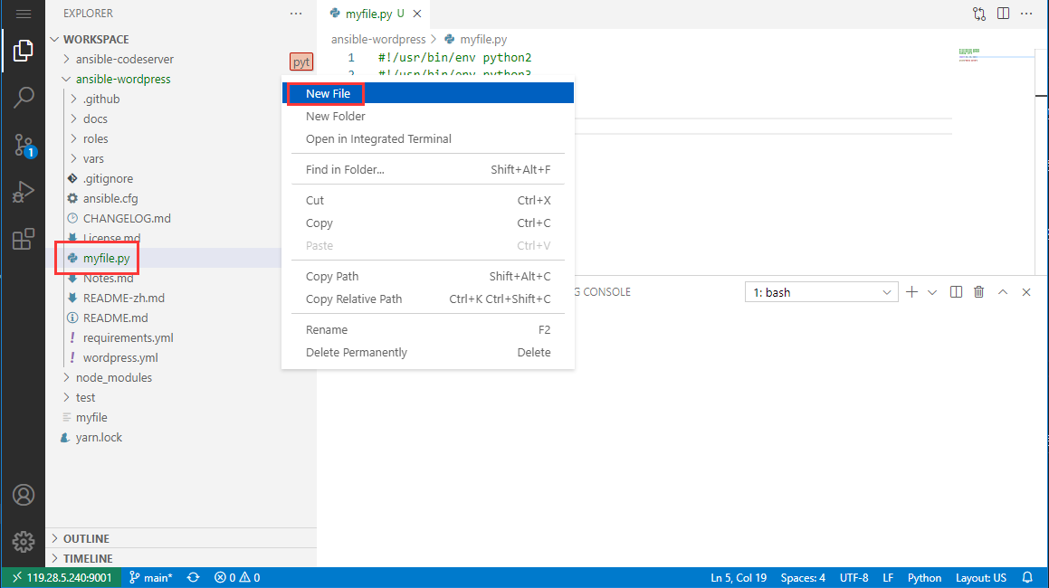 登录 code-server,新建一个文件夹和文件,文件命名为:myfile.py,并拷贝下面的 Python 程序实例代码。