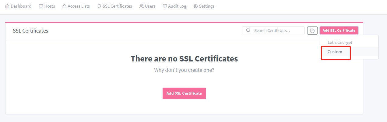 Open the Add SSL Certificate > Custom to upload certificates