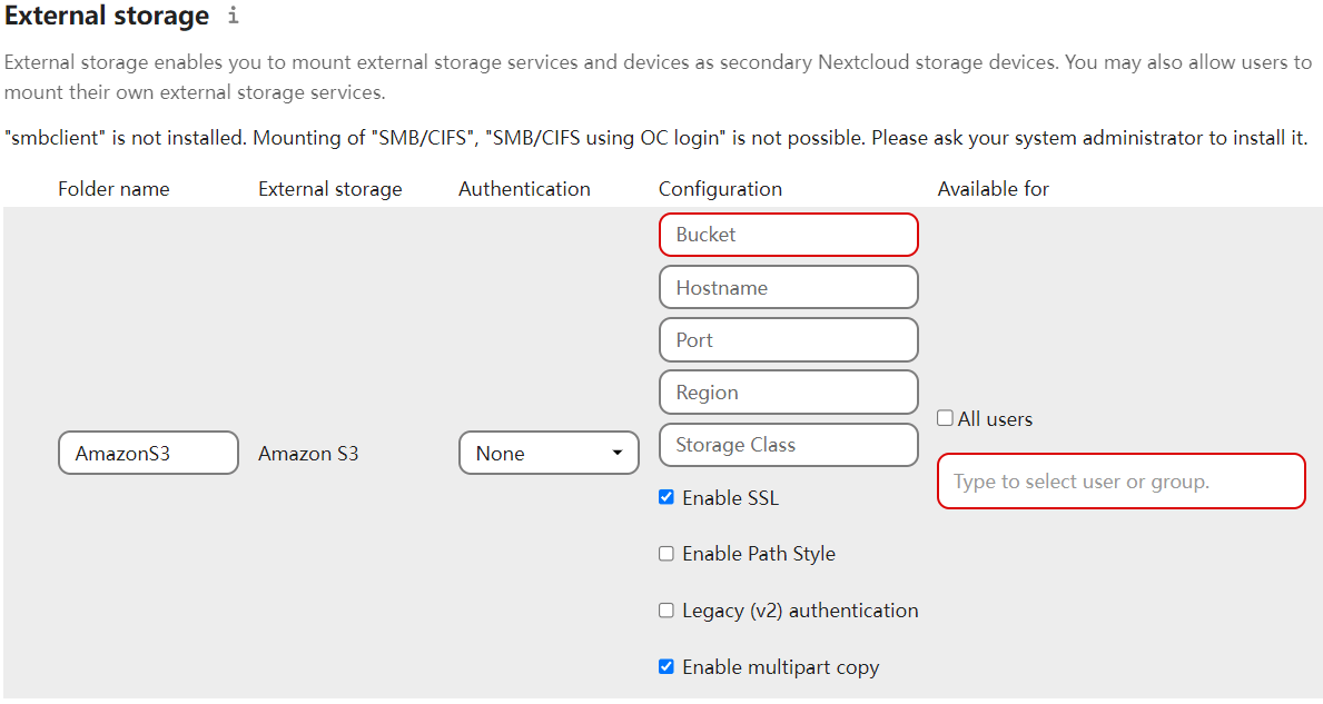 In Administration Settings of the Nextcloud backend, set up external storage with S3 compatibility protocol settings:
